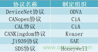 這個(gè)規(guī)則,定義了CAN報(bào)文中幀ID及幀數(shù)據(jù)的使用方式,如將幀ID定義為需要處理該幀數(shù)據(jù)的CAN節(jié)點(diǎn)地址等。根據(jù)應(yīng)用場(chǎng)合的不同,國(guó)際上出現(xiàn)了多種CAN應(yīng)用層協(xié)議,常見(jiàn)的CAN-bus應(yīng)用層協(xié)議如下: