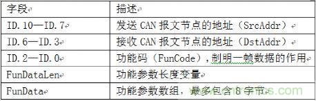 為了給讀者演示CAN應(yīng)用層協(xié)議的開(kāi)發(fā)和使用方法,下面定義一個(gè)簡(jiǎn)單的CAN應(yīng)用協(xié)議棧,該協(xié)議棧中只用到CAN標(biāo)準(zhǔn)幀中的數(shù)據(jù)幀,幀ID中的11個(gè)位的分配和使用方法如下表所列,協(xié)議中另外還定義了功能參數(shù)長(zhǎng)度變量FunDataLen的功能參數(shù)數(shù)組FunData,該數(shù)組在需要時(shí)可以為某些特定功能函數(shù)提供足夠的控制參數(shù)。