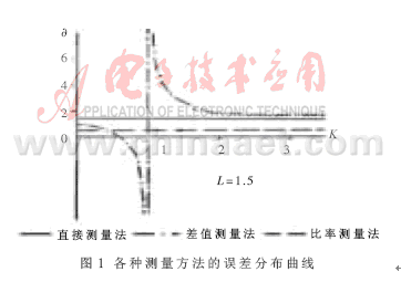 圖1表示取L=1.5時(shí)相對(duì)誤差隨元件值的分布情況。可以看出,比率測(cè)量法在很寬的測(cè)量范圍內(nèi)均具有良好的抗干擾能力。當(dāng)存在多個(gè)影響因素或者在分析由上述方法組合成的測(cè)量裝置時(shí),可根據(jù)疊加原理按系統(tǒng)誤差的理論綜合評(píng)定其精度。