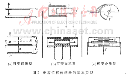 電容位移傳感器的三種基本類(lèi)型如圖2所示。其具體結(jié)構(gòu)可視實(shí)際運(yùn)用的場(chǎng)合靈活多變,電容極板可以是平面的或者球面的;運(yùn)動(dòng)電極可以采用水銀等導(dǎo)電液體。圖2所示的三種基本類(lèi)型均可組成差動(dòng)式結(jié)構(gòu),如各分類(lèi)中下部圖形所示。采用差動(dòng)式結(jié)構(gòu)能夠提高傳感器線(xiàn)路的輸出靈敏度,減小非線(xiàn)性,還能在一定程度上抑制由靜電吸引帶來(lái)的誤差。當(dāng)要求測(cè)量系統(tǒng)具有很高的分辨力時(shí),一般是保持極板面積相對(duì)固定而使電容傳感器極板間隙隨被測(cè)位移改變,即如圖2(a)所示的結(jié)構(gòu)。反之,采用保持間隙恒定而讓極板相對(duì)面積可變的結(jié)構(gòu),則可以在相當(dāng)大的動(dòng)態(tài)范圍內(nèi)獲得線(xiàn)性的響應(yīng)[1]。