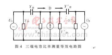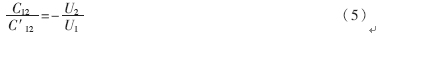 如果將兩個(gè)三端電容串接起來(lái),分別用兩個(gè)信號(hào)源供電,就形成了如圖4所示的等效電路,其中,Y12=jωC12,Y′12=jωC′12。在公共點(diǎn)D與接地端之間連接一個(gè)檢流計(jì),調(diào)節(jié)兩個(gè)外加電壓的幅值和相位,使通過(guò)兩個(gè)直接電容流向D點(diǎn)的電流大小相等、方向相反,直道檢流計(jì)指零,便可得到下面的關(guān)系式: