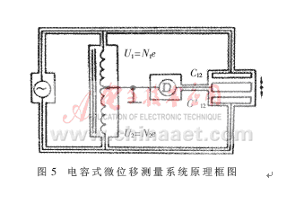 現(xiàn)以設(shè)計(jì)一個(gè)測(cè)量微小位移的系統(tǒng)為例來(lái)說(shuō)明上述測(cè)量方法的應(yīng)用。首先,用高導(dǎo)磁率環(huán)形鐵芯繞制出感應(yīng)耦合比率臂,再設(shè)計(jì)適當(dāng)?shù)目勺冮g距三電極差動(dòng)式電容位移傳感器的結(jié)構(gòu),并采用比率測(cè)量線(xiàn)路,就有如圖5所示的微位移測(cè)量系統(tǒng)原理框圖。對(duì)雙極板電容傳感器,不考慮電場(chǎng)的邊緣效應(yīng),兩個(gè)直接電容為:C12=