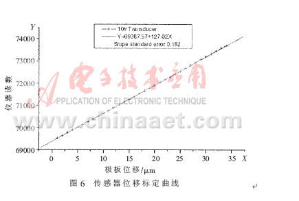 從最后獲得的極板位移與比率變壓器讀數(shù)的關(guān)系式(6)可知,讀數(shù)隨中心電極的位移呈線(xiàn)性變化。實(shí)際完成的系統(tǒng)由于結(jié)構(gòu)的不完善性,在接近量程的兩端會(huì)出現(xiàn)一定程度的非線(xiàn)性,如果采取等電位屏蔽等措施,可以把輸出特性的非線(xiàn)性降低到可以忽略的程度。可見(jiàn),將差動(dòng)式電容位移傳感器與比率測(cè)量方法結(jié)合起來(lái),設(shè)計(jì)的測(cè)量系統(tǒng)既有很高的分辨能力及較強(qiáng)的抗干擾能力,也能夠獲得很好的線(xiàn)性響應(yīng)。