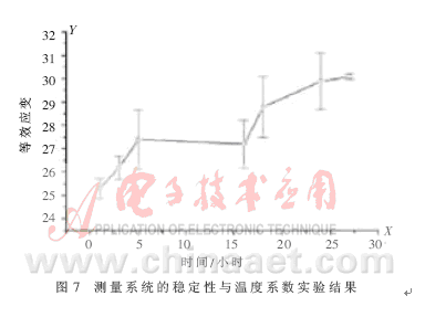 擬合方程顯示在圖中上部的方框里。從實(shí)驗(yàn)結(jié)果可看出,一微米位移可獲得變壓器電橋讀數(shù),變化為127.02,輸出特性的非線(xiàn)性誤差小于0.15%F.S.。比率臂第五檔變化一個(gè)數(shù)對(duì)應(yīng)的位移量根據(jù)傳感器結(jié)構(gòu)的不同,一般在5~8納米之間,末級(jí)的數(shù)據(jù)采集器可獲得300多毫伏的輸出,從數(shù)據(jù)采集器便能夠分辨出0.02納米的變化。在實(shí)驗(yàn)室環(huán)境下,傳感器測(cè)值隨著溫度的變化會(huì)產(chǎn)生極大的漂移,用標(biāo)準(zhǔn)元件來(lái)檢查變壓器電橋測(cè)量系統(tǒng)的溫度系數(shù)與穩(wěn)定性,所得結(jié)果見(jiàn)圖7。在28小時(shí)的實(shí)驗(yàn)期間測(cè)值等效變化僅為0.1納米,環(huán)境溫度變化為3~4℃。作者還曾將差動(dòng)電容式位移傳感器放到100米深的鉆井底部,那里溫度的年變化不到0.03℃,整個(gè)位移測(cè)量系統(tǒng)月漂 移率僅為0.1納米[3]。