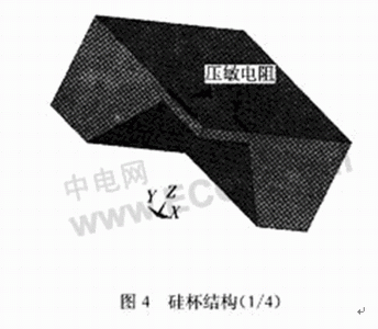 其中,壓阻式壓力傳感器主要是利用半導體的壓阻效應(yīng),把一個惠斯通電橋做在一個硅杯上,如圖4所示。當硅杯受到壓力后發(fā)生形變,惠斯通電橋的四個橋臂電阻就會發(fā)生變化,打破了電橋的電平衡,從而會有一個電信號的輸出。