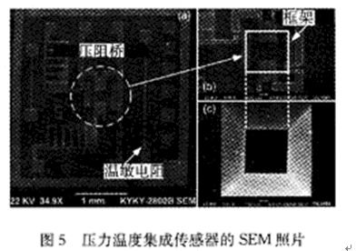 圖5是本文制作的傳感器芯片的電鏡照片。圖5(a)為器件正面全貌;圖5(b)為薄膜正面;圖5(c)為薄膜背面。其中壓敏元件采用比常規(guī)更厚的50μm硅杯薄膜(500 μm×500μm),增大了體硅上高應(yīng)力區(qū)的面積,在降低工藝要求的同時提高了線性測量范圍和過載壓力。壓敏電阻設(shè)計為折線結(jié)構(gòu),采用優(yōu)化的幾何尺寸,并將其部分制作在高應(yīng)力體硅上以獲得更高靈敏度。體硅上的溫敏電阻隨壓敏電阻利用同步注入工藝制作,減小了工藝復雜度。該器件工藝簡單,成品率高,與標準IC工藝兼容。