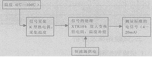 熱電偶作為感溫元件,采集溫度信號;鉑電阻作為補償電阻,補償熱電偶的冷端溫度;XTR101為小信號處理專用芯片,將輸入的微弱信號放大后便于遠端傳輸;RL為遠端的負載電阻,便于電信號的測量。