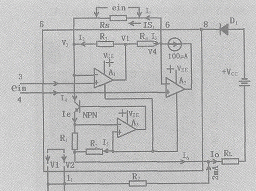 Rs為增益調節電阻,調節Rs可使輸入電壓ein在從最小值變到最大值時使輸出電流Io從4mA變到20mA。即△I=16mA的輸出電流。需要注意的是:為使Io不超過20mA,當Rs=∞時,ein不應超過1V,而當Rs減小時,ein也應相應減小。