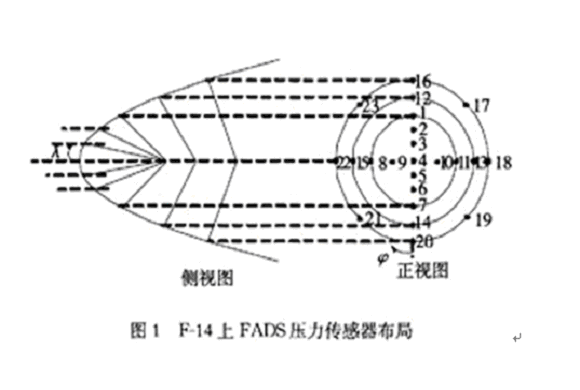 FADS一般安裝在飛行器前端,為了不影響雷達和火控裝置的安裝,也有將FADS安裝在機翼前端。F-14的FADS由23個壓力傳感器組成,安裝在機身前端。X-33的FADS系統(tǒng)則由6個壓力傳感器組成,安裝在機身前端。壓力傳感器的數(shù)目并沒有固定的規(guī)定。在F-14飛機上,其FADS的壓力傳感器布局如圖1所示。