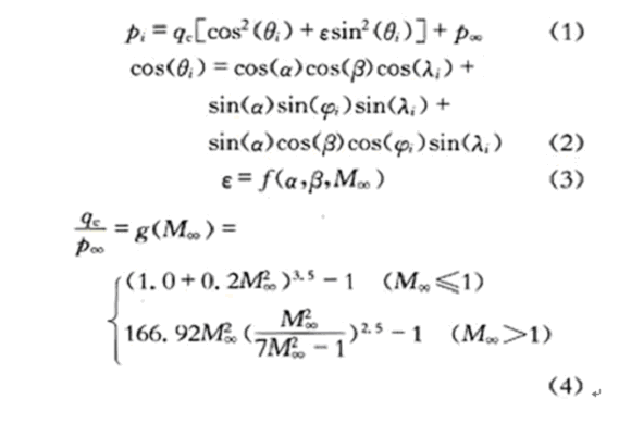 FADS系統(tǒng)的空氣動力學模型把位流模型與修正的牛頓流模型(前者主要適用于亞音速條件,后者主要適用于超音速條件)與一個修正系數(shù)ε相結合,形成了不同馬赫情況下的帶補償?shù)目諝鈩恿W模型。ε的數(shù)值是在綜合考慮了壓縮效應、氣動外形、系統(tǒng)影響等因素而選取的。在飛行中,可以將其看成攻角、側(cè)滑角和馬赫數(shù)的函數(shù),其函數(shù)關系可以在飛行前確定。
