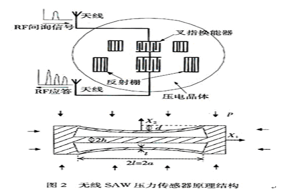 不同于聲表面波延遲線結構的SAW壓力傳感器,圖2所示的結構采用兩個單端諧振器并聯(lián)。SAW諧振器在諧振時瑞利波通過反射柵形成多次疊加,其能量也多次疊加,因而相對減少了傳播損耗和插入損耗,具有較高高的Q值。同時SAW諧振器靈敏度高,精確度高,且能長時間保持穩(wěn)定。利用這種結構設計來無線測量壓力,能減少SAW壓力傳感器的傳播損耗和插入損耗,因而這種原理結構具有良好的應用潛力。
