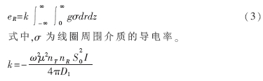 在發(fā)射頻率不高、介質(zhì)導(dǎo)電率較小的條件下,可忽略電磁波傳播效應(yīng)和渦流損耗,用幾何因子理論對(duì)接收線圈中的二次感應(yīng)電動(dòng)勢(shì)進(jìn)行計(jì)算,將同軸于z的兩線圈周圍介質(zhì)中的感應(yīng)渦流分割成以探頭軸心為圓心、半徑為r、距線圈T和R距離分別為ρT和ρR的小單元環(huán)電流。將探頭周圍介質(zhì)看作是均勻無(wú)限介質(zhì),把所有的單元環(huán)感生的電動(dòng)勢(shì)疊加在一起得到: