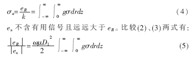 式中,ω為發(fā)射電流的頻率。由式(2)可以看出,ex是一個(gè)落后于發(fā)射電流π/2且與探頭周圍介質(zhì)導(dǎo)電率無(wú)關(guān)的電勢(shì)信號(hào)。在系統(tǒng)的接收信號(hào)中,它表現(xiàn)為一個(gè)幅值較大的背景噪音。