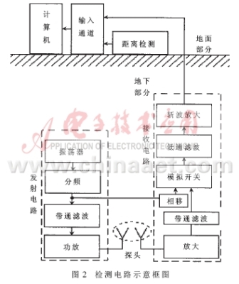 整個(gè)系統(tǒng)分為地上和地下兩部分,其基本組成結(jié)構(gòu)如圖2所示。兩大部分之間通過電纜相連接。地下部分中包括裝有線圈的探頭以及分別屏蔽在兩個(gè)金屬盒中的發(fā)射電路和接收電路。地下部分的所有裝置全部固定安裝在一節(jié)經(jīng)過防水處理的直徑為8cm左右的聚氯乙稀管內(nèi)。為了防止對(duì)探頭檢測(cè)過程的干擾,設(shè)計(jì)時(shí)應(yīng)該充分考慮地下部分的電路及導(dǎo)線的固定和屏蔽問題。