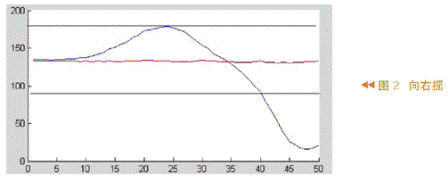 從圖1和圖2中可以看出,兩條黑線之間的數(shù)據(jù)很難斷定是哪個(gè)動(dòng)作產(chǎn)生的,因?yàn)閮蓚€(gè)動(dòng)作都可能產(chǎn)生這樣的值。所以,利用黑線之外的數(shù)據(jù)來判定是向右還是向左搖。因?yàn)閷?duì)于這兩個(gè)動(dòng)作,黑線之外的數(shù)據(jù)有明顯的差異,數(shù)據(jù)相差很多。對(duì)于圖1這些數(shù)據(jù)大于150,圖2中這些數(shù)據(jù)小于90。因此這些數(shù)據(jù)至少相差60,可以很容易地將向左、向右的兩個(gè)動(dòng)作區(qū)分開。