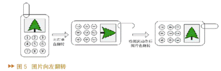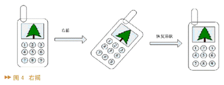 系統(tǒng)設(shè)計(jì)了六種動(dòng)作,他們分別是左搖、右搖、下?lián)u、上搖、圖片左轉(zhuǎn)、圖片右轉(zhuǎn)。圖4中的圖形象地說明了其中的兩個(gè)動(dòng)作,其它的動(dòng)作與此類似。