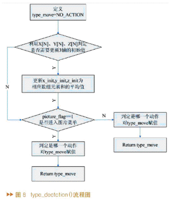 動(dòng)作檢測主要是用獲得的三組數(shù)據(jù)值x_data[N]、y_data[N]、z_data[N]來判定當(dāng)前動(dòng)作是系統(tǒng)設(shè)定動(dòng)作中的哪一個(gè),如果符合,則發(fā)送這個(gè)動(dòng)作對(duì)應(yīng)的預(yù)定義值給演示終端,否則發(fā)送NO_ACTION。type_dectction()用來實(shí)現(xiàn)動(dòng)作檢測,其中type_move為函數(shù)內(nèi)部變量,用于記錄動(dòng)作代碼。type_dectction()進(jìn)行動(dòng)作檢測的流程如圖8所示。