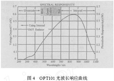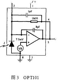 在本文中, 采用一種新型的光敏元件OPT101 , 該元件將感光部件和放大器集成在同一個(gè)芯片內(nèi)部, 這種集成化的設(shè)計(jì)方式有效地克服了后端運(yùn)算放大器空載電流輸出對(duì)光敏部件輸出電流的影響, 而且芯片輸出的電壓信號(hào)可以通過(guò)外部的精密電阻進(jìn)行調(diào)節(jié), 有利于芯片適應(yīng)整體的電路設(shè)計(jì), 同時(shí)芯片的集成化設(shè)計(jì)也能夠減小系統(tǒng)的功耗。