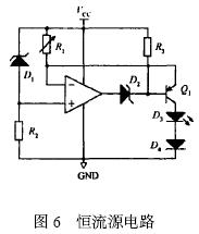 圖6 為恒流源電路, 在電路中R1 兩端的電壓值恒等于穩(wěn)壓二極管D1 的穩(wěn)壓值,因此流經(jīng)R1 的電流值恒定,控制使三極管Q1 處于放大狀態(tài), 那么流過(guò)發(fā)光二極管D3 的電流值恒定,因此發(fā)光二極管D3 能輸出穩(wěn)定光強(qiáng)的光。[page]