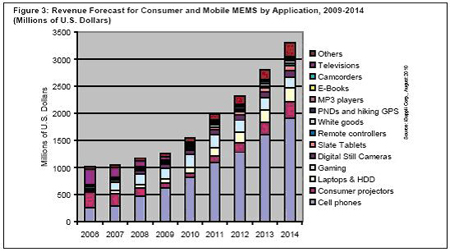 但是,消費(fèi)與移動(dòng)MEMS預(yù)計(jì)到2014年將成為最大的MEMS領(lǐng)域,現(xiàn)在已是最大的MEMS市場(chǎng)之一。感測(cè)器已進(jìn)入日常設(shè)備之中,如筆記本電腦、MP3播放器、遙控器和便攜導(dǎo)航設(shè)備。