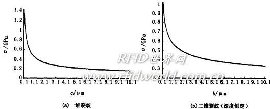 對于碎裂面垂直于芯片表面,深a、長2b的二維半橢圓型裂紋而言,則滿足Ccr=[(Φ2KIC2)/(1。2πσIC2)][2],其中Ccr=(acrbcr)1/2,acr為臨界裂紋深度,bcr為臨界裂紋半長;裂紋幾何因子Φ=(1。2π)1/2/Y。設裂紋長為2b,深度恒定為1μm,代入斷裂韌度KIC=0。82MPa,Y=1。42得,平面應力狀態常載荷條件下碎裂的臨界強度σ=0。58/4b(GPa)可見,芯片碎裂臨界強度隨著微裂紋長度的增大而急劇降低,當裂紋大于1μm時,下降趨勢逐漸平緩,并趨于穩定小值。