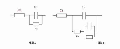 在模型A中電阻器Rs表示金屬所在的溶液,而電容Cc表示金屬表面的保護(hù)涂層或涂料,這表示初始涂層的電容。經(jīng)過(guò)一段時(shí)間后,水滲入涂層中形成新的液體和金屬界面。隨著金屬的腐蝕,通過(guò)溶液與金屬之間的保護(hù)涂層形成離子導(dǎo)電路徑。這可以用Rx與Cc并聯(lián)模型來(lái)表示。另外,有些模型(模型B)還有一個(gè)附加的R和C并聯(lián)起來(lái)再與Rx串聯(lián)的電路來(lái)表示金屬保護(hù)涂層隨著時(shí)間變化的分層模型。