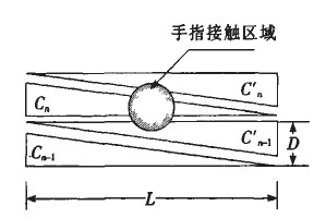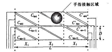 Ca(n)、Cb(n)、為第一組感應(yīng)電極,Cb(n)、Cb(n)''''為第二組感應(yīng)電極,Ca(n)''''、Cb(n)''''為第三組感應(yīng)電極,分別感應(yīng)X1、X2、X3范圍內(nèi)坐標(biāo)點(diǎn)的位置。具體坐標(biāo)計(jì)算方法與上述類似。設(shè)計(jì)中需要注意X1、X2、X3每組電極的寬度應(yīng)與手指接觸面積的寬度相當(dāng),如寬度不足則需要增加菱形電極,否則手指接觸在相同區(qū)域內(nèi)無法識(shí)別兩個(gè)感應(yīng)點(diǎn)。