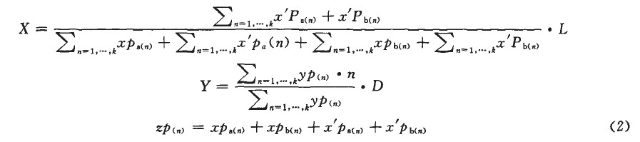 單點(diǎn)工作方式與上述坐標(biāo)計(jì)算方法相同,X坐標(biāo)的計(jì)算是通過左側(cè)兩通道的感應(yīng)值加和與右側(cè)兩通道感應(yīng)值加和的比例來計(jì)算的。y是通過同一行的左右4通道感應(yīng)值的加和與上下行的感應(yīng)值加和的比例來計(jì)算的。具體計(jì)算方法由式(2)確定: