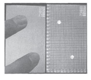 實(shí)際電極設(shè)計(jì)中,每對(duì)感應(yīng)單元設(shè)計(jì)為多組電極,并根據(jù)Lens的厚度設(shè)計(jì)電極面積以及間隙大小。間隙過大會(huì)導(dǎo)致線縫可見,因此使用假電極進(jìn)行填充使線縫在30μm以內(nèi)則可以避免上述問題。經(jīng)過實(shí)際測(cè)試,在實(shí)現(xiàn)單點(diǎn)觸控基本功能的同時(shí),能夠?qū)崿F(xiàn)兩點(diǎn)觸控,滿足設(shè)計(jì)要求。操作效果如圖5所示。