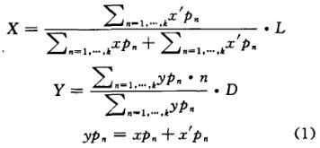 其中Cn代表第九組電極的Cp。n代表電極的組數(shù),L是電極寬,D是一組電極的高。其X坐標(biāo)的計(jì)算是通過左側(cè)通道的感應(yīng)值加和與右側(cè)通道感應(yīng)值加和的比例來計(jì)算的。y是通過同一行的左右兩通道感應(yīng)值的加和與上下行的感應(yīng)值加和的比例來計(jì)算的。具體計(jì)算方法由式(1)確定: