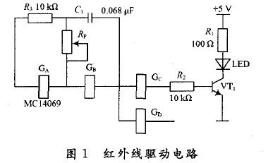 為減少自然光、照明光和其他干擾光的影響,需對反相器電路產(chǎn)生的脈沖輸出進行脈沖調(diào)制,反相器中的GA和GB構(gòu)成振蕩電路,如果反相器GA和GB的門限電平為1/2Ucc(Ucc為MC14069電源電壓),則電路的振蕩頻率f,由電容C1和電位器Rp 的值決定,即f=1/(2.2Rc)。其中,R為Rp的阻值,C為C1 的電容值。