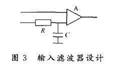 對于高精度mV 級的DC放大器,其各種交流干擾都將成為放大器寄生信號的重要信號源,因此,必須在運算放大器的輸入端加輸入濾波器,通常由一個大電阻(4.7 kΩ)和一個小電容(3.3μF)構(gòu)成RC濾波,如圖3所示。
