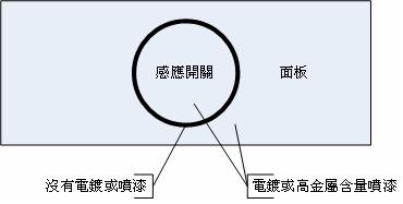 d.同樣的,感應電極與手指之間不能有金屬層夾在中間,所以面板上不可以有金屬電鍍及含金屬超過15%的噴漆等會形成導電層的設計。