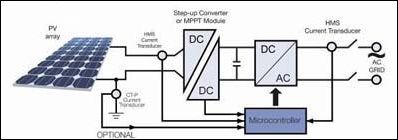 通常在剛好在PV 方陣后使用最大功率點跟蹤(MPPT)組件來確保方陣工作在其最大功率運行水平。通過使用用于跟蹤功能的電流和電壓傳感器,應用一種特殊軟件算法和專用電子元件一起來控制電池板(電池)的工作點。一般來說,一臺電流傳感器可用于測量單相輸出(供到電網的電流),而另一臺傳感器可用于測量輸入直流電流(10-25A)。在三相輸出的情況下,兩臺傳感器可用于測量三相輸出的交流電流。接入電網的DC/AC逆變器是一臺將直流信號轉換為正弦波的全橋逆變器。