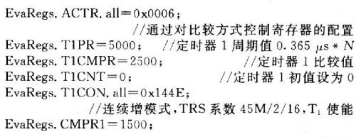 TMS320的事件管理模塊總共能輸出16路PWM信號,文中僅需要輸出一路占空比可調的PWM信號,并設計從PWMl引腳輸出該方波信號。文中選用通用定時器1(T1)作為時基;全比較單元1保存調制值;計數方式采用連續增計數模式。PWM占空比值與T1的三角波數據比較,輸出PWM信號控制半導體制冷片工作。各寄存器設置如下(高速外設時鐘為22.5 MHz):