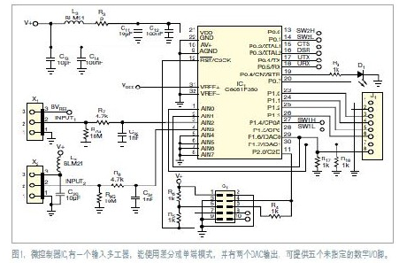 本設計中的電路包括一個混合信號微控制器、一只USBUART(通用異步接收器/發射器),還有一個新穎的自適應模擬傳感器輸入電路。此電路可以將多種類型的傳感器接到設計的兩個模擬輸入通道上,在一個USB主機上控制這些設備,讀出測量數據。USB連接為電路提供電源。在計算機上就能用簡單指令控制設備;甚至用終端軟件也可以做測量工作。8051核有免費的工具, 便于做編程工作, 如IDE(集成開發環境)、調試器以及C編譯器?! ?br />