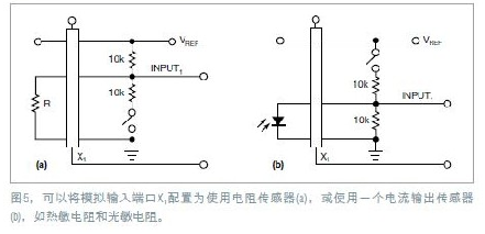 模擬輸入架構能夠直接連接多種類型的傳感器。例如,可以在接地端與輸入端之間連接熱敏電阻或光敏電阻,并接通上拉電阻,構成一個分壓器;片上的ADC可以直接對這個分壓器的輸出做數字化(圖5)。這種方案還采用了比率工作方式,意味著ADC使用與分壓器驅動電壓相同的電壓基準。電流輸出傳感器也可以像光電二極管那樣連接,即直接連到接地端與輸入端之間。切換到下拉電阻,使光電流能產生一個電壓?! ?/p>