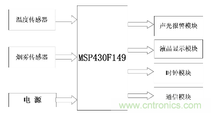 該系統以單片機MSP430F149 為核心,以環境溫度、煙霧濃度作為判斷火災的依據,完成了對火災的預警。主要由單片機控制模塊、時鐘模塊、煙霧濃度測量模塊、DS18B20溫度測量模塊、聲光報警模塊、1602 液晶顯示模塊和電源構成。