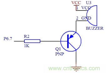 蜂鳴器在微處理器判斷為火災時發出報警指示音。由于單片機的I/O 口驅動能力有限,選用PNP型晶體管2N5401 組成晶體管驅動電路來驅動壓電式蜂鳴器。