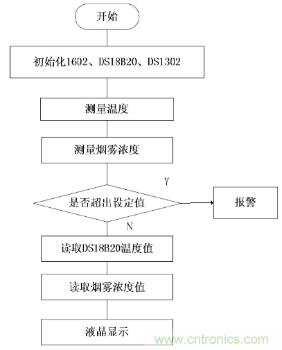 系統軟件流程圖上電后首先對單片機、1602 和DS1302 進行初始化,初始化完成后,對溫度和煙霧濃度進行測量,將測量值與設定值進行比較,如果超出設定范圍,則進行報警,如果未超出,則在液晶上顯示時間、溫度值和煙霧濃度值。