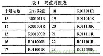 編碼采用格雷碼(Gray)為數(shù)值碼,以某一固定碼寬為參考碼R,它用于標(biāo)尺定位和提高精度。Gray碼是一種絕對(duì)編碼方式的無(wú)權(quán)碼,它所具有的循環(huán)、單步特性能消除隨機(jī)取數(shù)時(shí)出現(xiàn)重大誤差的可能,其任意兩個(gè)柏鄰整數(shù)之間轉(zhuǎn)換時(shí),只有一個(gè)位數(shù)發(fā)生變化,大大減少了由一個(gè)狀態(tài)轉(zhuǎn)到下一個(gè)狀態(tài)時(shí)的邏輯混淆,具有較強(qiáng)的容錯(cuò)能力。以6位編碼為例,其部分十進(jìn)制數(shù)與Gray碼的一一對(duì)應(yīng)關(guān)系如表1所示。