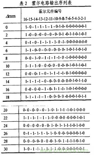 霍爾電路的工作原理是,在外磁場(chǎng)的作用下,當(dāng)磁感應(yīng)強(qiáng)度B超過(guò)導(dǎo)通工作點(diǎn)時(shí),霍爾電路輸出管導(dǎo)通,輸出低電-半:若曰值低于釋放點(diǎn)時(shí),輸出管截止,輸出高電半。因此在“凸槽”時(shí)鋼質(zhì)活塞桿被磁化,磁感應(yīng)強(qiáng)度曰增加,霍爾電路導(dǎo)通,輸出低電平,用“1”表示;在“凹槽”時(shí)輸出高電平,用“0”表示。以第1個(gè)霍爾元件為測(cè)量基準(zhǔn),從圖2所示時(shí)刻起,位移暈旃次變化b=2mm時(shí),一個(gè)碼區(qū)行程內(nèi)霍爾電路輸出的二進(jìn)制序列如表2所示。分析可知,序列的標(biāo)識(shí)碼為l 0000000 1,其前面或后面6位序列數(shù)分別為相鄰的兩個(gè)數(shù)值碼,這使它具有很強(qiáng)的容錯(cuò)能力。標(biāo)識(shí)碼每隔一個(gè)霍爾元件間距N在低位部分右移一位。值得注意的是,標(biāo)識(shí)碼前面的數(shù)值碼代表磁性標(biāo)尺當(dāng)前檢測(cè)位置下一個(gè)碼區(qū)的值。