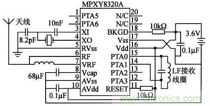 檢測模塊由胎壓測量專用高集成芯片MPXY8320A微控制器和電源組成,檢測模塊電路原理如圖4所示。MPXY8320A工作在DC 2.1~3.6 V,具有低功耗的效能以延長電池壽命。MPXY8320A最大的特點是,其內(nèi)部集成了8位MCU、適應載重型輪胎的壓力傳感器、溫度傳感器、供電電源電壓監(jiān)測、X-Z軸上的加速度傳感器以及RF發(fā)送模塊,所以MPXY8320A是一款專為交通工具胎壓測量而設(shè)計的高集成芯片。由于器件的高集成度,在體積上、功耗上、電磁兼容性方面都有很出色的表現(xiàn)。