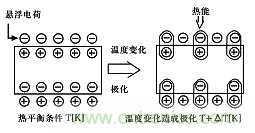 當一些晶體受熱時,在晶體兩端將會產生數量相等而符號相反的電荷,這種由于熱變化產生的電極化現象,被稱為熱釋電效應。通常,晶體自發極化所產生的束縛電荷被來自空氣中附著在晶體表面的自由電子所中和,其自發極化電矩不能表現出來。當溫度變化時,晶體結構中的正負電荷重心相對移位,自發極化發生變化,晶體表面就會產生電荷耗盡,電荷耗盡的狀況正比于極化程度,圖1表示了熱釋電效應形成的原理。