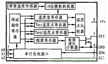 與I2C兼容的接口總線在AD7416上電后就一直有效,因此在芯片處于休眠狀態下仍可進行片內數據的讀出和寫入。