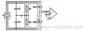 第三個問題是分布電容的影響。由于電容傳感器一個很關鍵的問題是分布電容電容量與傳感器電容量相比不僅不能忽略,而且影響還極其嚴重,其后果是造成傳輸效率降低、靈敏度下降、測量誤差增加及穩定性變差。近幾年來,對此問題有了新的解決途徑。其中“整體屏蔽法”就是一例,以差動電容傳感器為例,說明整體屏蔽法,在下圖中,CX1、CX2為差動電容,U為電源,A為放大器,整體屏蔽法是把整個電橋(包含電源電纜等)一起屏蔽起來,設計的關鍵點在于接地點的合理設置。采用把接地點放在兩個平衡電阻R1、R2之間與整體屏蔽共地,這樣,傳感器公用極板與屏蔽之間的分布電容C1與放大器的輸入阻抗并聯,從而可把C1視作放大器的輸入電容。由于放大器的輸入阻抗有極大值,C1的并聯也不希望存在,但它只影響靈敏度而已,另外兩個分布電容C3、C4并聯在橋臂R1、R2上,會影響電橋的初始平衡和整體靈敏度,并不影響電橋的正常工作。因此,分布參數對傳感器電容的影響基本消除,整體屏蔽法是解決電容傳感器分布電容問題的很好方法,缺點是使結構復雜。