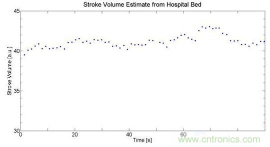通過先進的濾波算法,可以從病床的諧振與噪聲中分離出心搏圖數據,如圖4估算出的心率和搏量,其中的血搏量是不帶單位的數據,它需要進行標定才能等到一個絕對值。圖4中的搏量變異性估算得相當準確,它可以用于估算呼吸率。