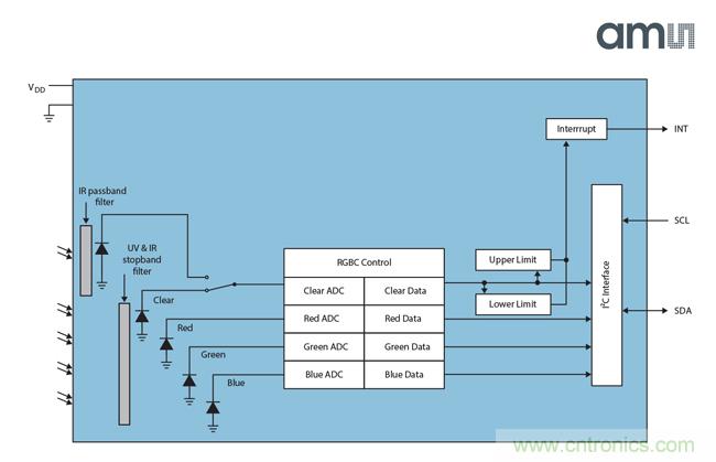 四個(gè)獨(dú)立的模擬數(shù)字轉(zhuǎn)換器(ADC)分別對(duì)應(yīng)一個(gè)RGB通道, C通道和紅外線通道共用第四個(gè)模擬數(shù)字轉(zhuǎn)換器。四個(gè)通道同時(shí)取樣能避免快速變化的光照條件下CCT和光照強(qiáng)度的測(cè)量出錯(cuò)。TCS3490傳感器的光電二極管被安排在一個(gè)輻射狀結(jié)構(gòu)上,因此光線從任意方向射入都能獲得一致的有效響應(yīng),尤其是從圓形的窗口中射入的光。當(dāng)光線測(cè)量值或顏色測(cè)量值超過(guò)預(yù)設(shè)的閾值時(shí),傳感器會(huì)向處理器發(fā)送中斷信號(hào),避免處理器不停地通過(guò)I2C接口輪詢,幫助降低整個(gè)系統(tǒng)的功耗,延長(zhǎng)電池壽命。