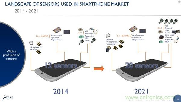 根據(jù)有關機構(gòu)的預計,2014年智能手機內(nèi)的平均傳感器數(shù)量為12顆,而到2021年這一數(shù)量將增加到20顆;除了一些必要的同類傳感器數(shù)量會增多之外,也有不少針對專業(yè)領域的機型會考慮搭載一些普通消費者無法想象的傳感器。