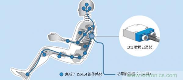 采集好的傳感器數(shù)據(jù)之后會被傳遞給假人體內(nèi)的奇石樂DTI中央數(shù)據(jù)記錄器,再通過以太網(wǎng)繼續(xù)傳給COMBox/KiHUB數(shù)據(jù)接口設(shè)備。車內(nèi)所有DTI系統(tǒng)通過該設(shè)備與中央網(wǎng)絡(luò)相連。這種解決方案的亮點在于:同步數(shù)據(jù)、觸發(fā)測試、供電僅需一根電纜。電纜始于假人,終于車載數(shù)據(jù)采集器。采集器一般通過隨行電纜等與主機相連。